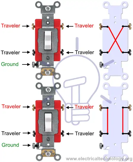 - Connect the traveler wires (usually red and black) to the two traveler terminals on both switches.